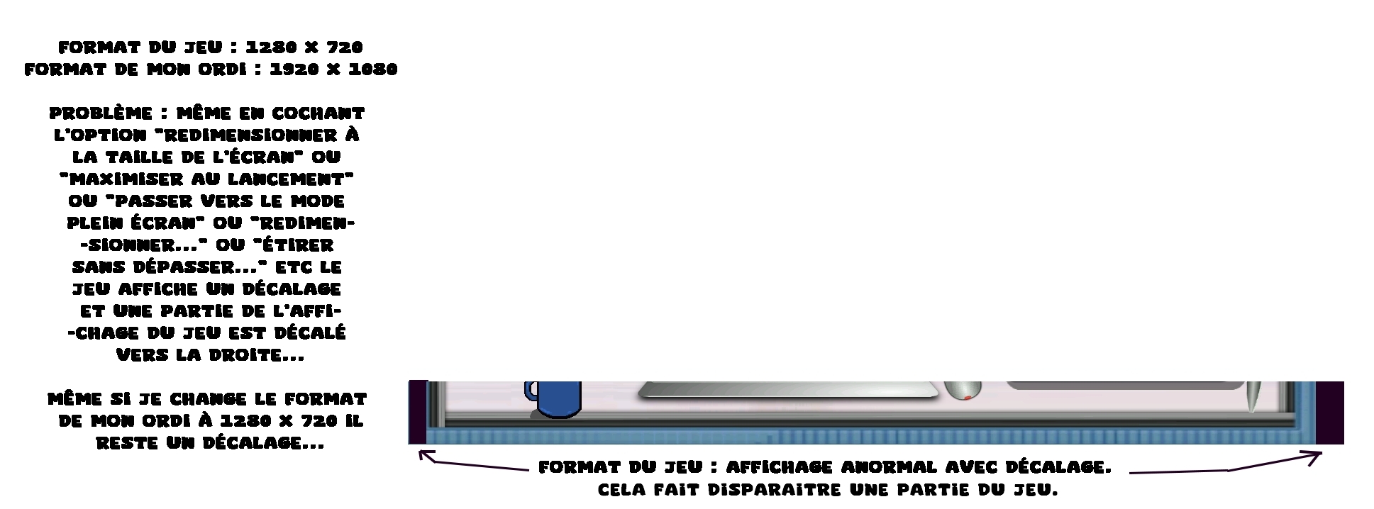 Alors, en effet, moi aussi j'ai fait un test sur un ordi portable et il fonctionne très bien, tout est nickel au niveau de la taille du jeu on voit bien les deux bordures et la qualité graphique est parfaite. Je pense que c'est mon écran qui à un soucis de paramétrage en effet. Alors là par contre je ne vois vraiment pas comment faire. Au moins c'est rassurant d'un côté de l'autre je ne comprends pas pourquoi mon écran fait ça. Et je ne sais pas si ça risque pas de le faire sur d'autres ordinateurs...