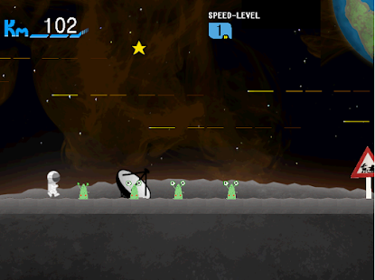 Une petite image qui nous montre de qui le jeu à été créer, et puis nous voilà à l'écran titre. Nous pouvons soit jouer, soit voir les scores, et le but du jeu ainsi que son synopsis est indiqué. Nous dirigeons donc un cosmonaute qui veut se boire une bonne bière à la base mais, durant son trajet, il doit à tout prix évité les E.T qui lui entrave la route. Pour cela, nous avons droit à un gameplay très simple : Le personnage se déplace automatique et il faut sauter en appuyant sur l'écran au bon moment pour ne pas se prendre un E.T. Nous pouvons aussi rallonger le saut avec le Jet-Pack en restant appuyer. Cependant, plus le jeu continu, et plus la vitesse augmente et plus les E.T sont difficile à éviter. Nous pouvons remarquer des petits événements qui se passe au cours du jeu comme le père noël qui survole notre personnage par exemple, des détails qui fait son charme.